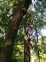 I worked through all the strips I had and created a lot of curved wire pieces, strung with aluminum strips, all of various lengths. I wanted to hang them from rings of higher gauge wire, and in the process of hanging them found I could make multiple sculptures. Looking out my window on Central Campus, I thought it would look neat if I hung all the sculptures in one place, making sure anyone who was around it would notice.
